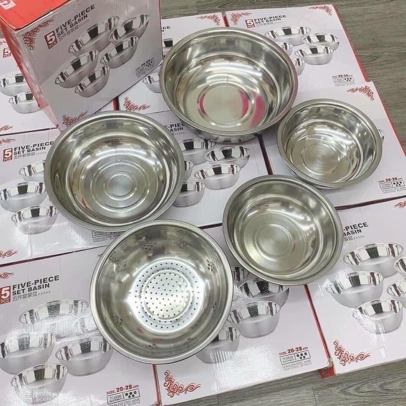 Bộ 5 tô inox các cỡ từ to đến nhỏ 5 kích thước (4 tô 1 rổ)
