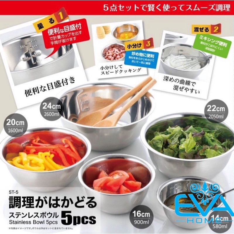 Giới thiệu Bộ 5 Tô Inox Xuất Nhật Gồm 5 Size Và Có Vạch Chia Đo Lường Cao Cấp M3556