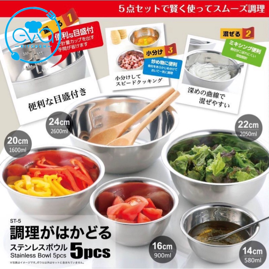 Giới thiệu Bộ 5 Tô Inox Xuất Nhật Gồm 5 Size Và Có Vạch Chia Đo Lường Cao Cấp M3556