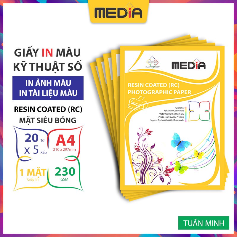 Văn Phòng Phẩm > Sổ & Giấy Các Loại > Giấy In || Bộ 5 Xấp Giấy In Ảnh Cao Cấp Media RC 1 Mặt Siêu Bóng A4 230gsm 20 Tờ x 5Còn hàng