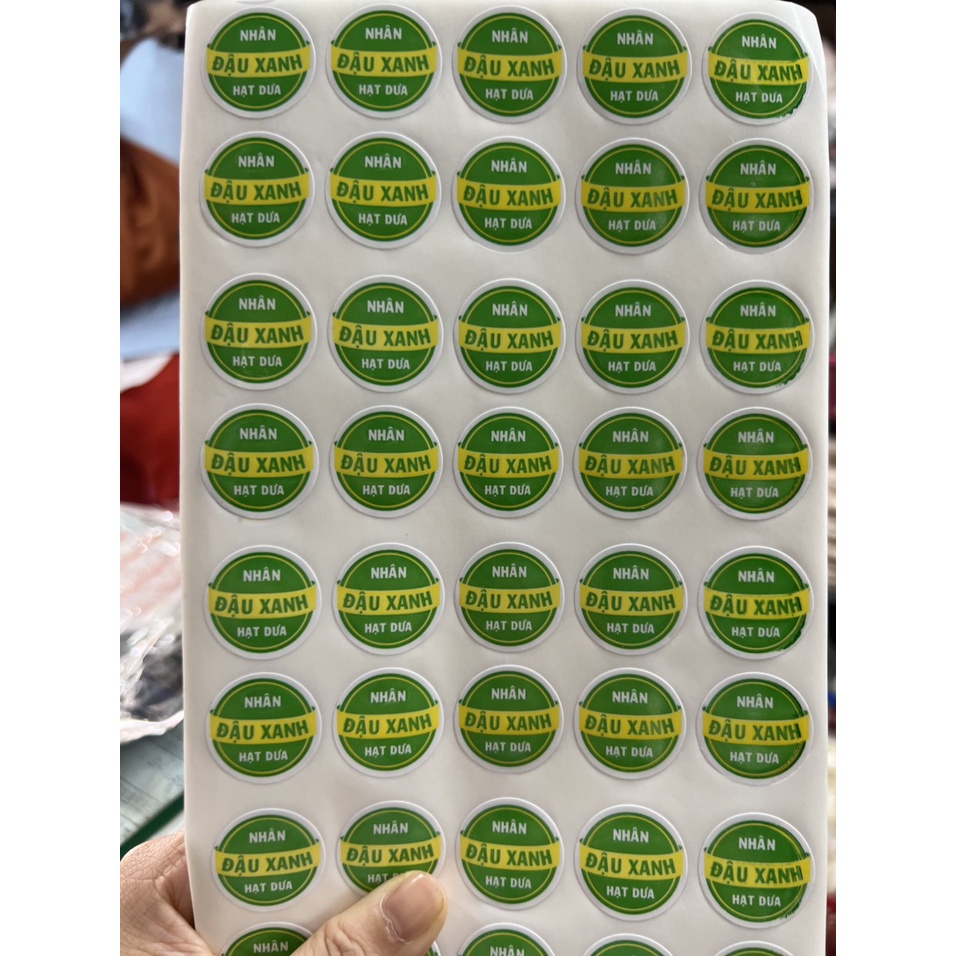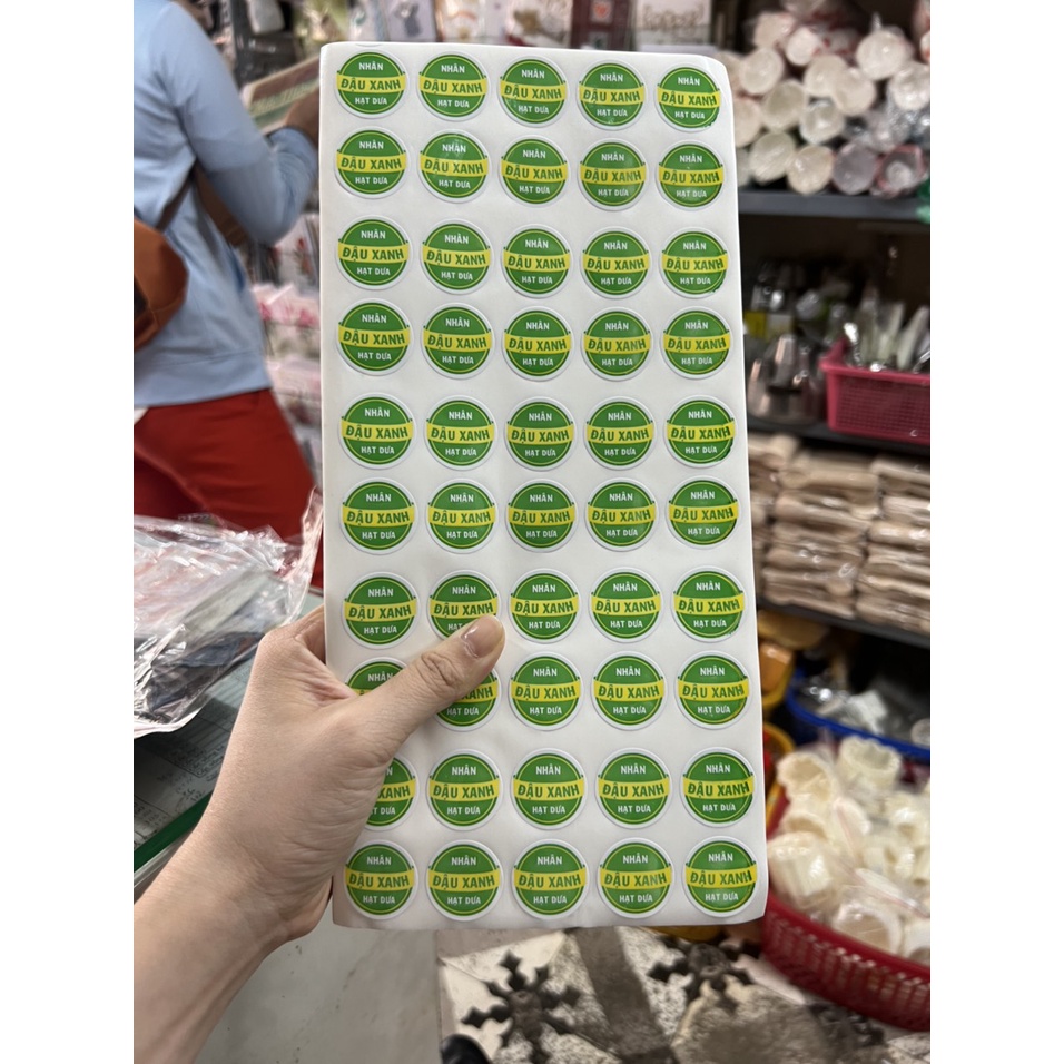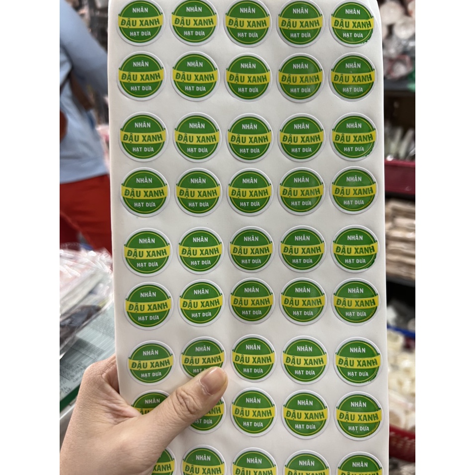 Sản phẩm gồm 1 tờ tem dán nhân bánh trung thu nhân đậu xanh hạt dưa1 tờ có 50 cái tem