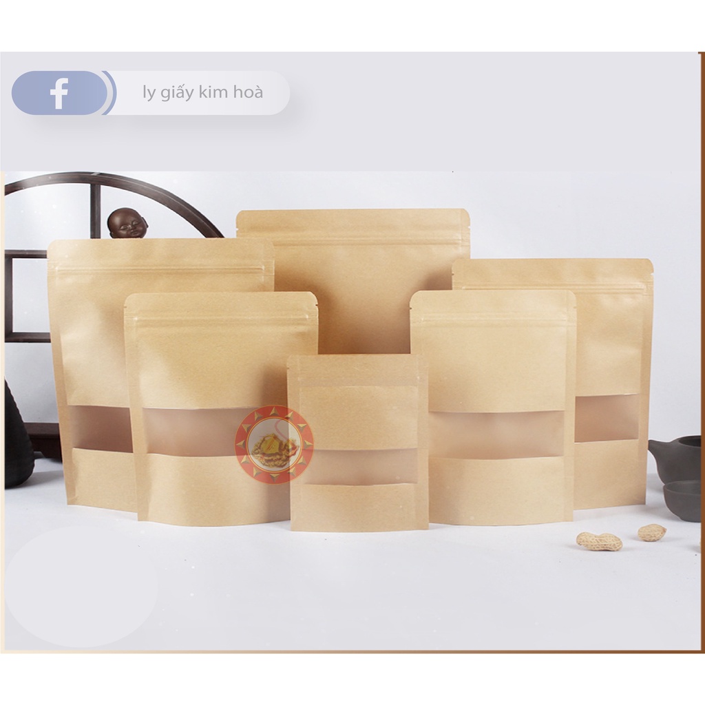 Giới thiệu 50 cái Túi zip đựng thực phẩm giấy kraft có cửa sổ - đáy đứng