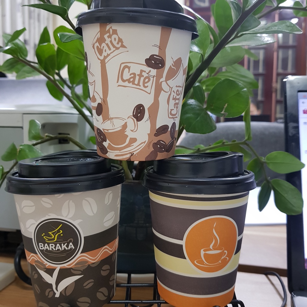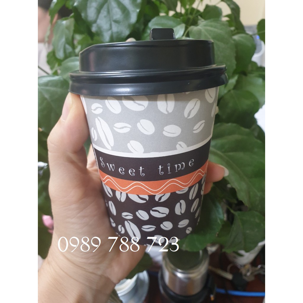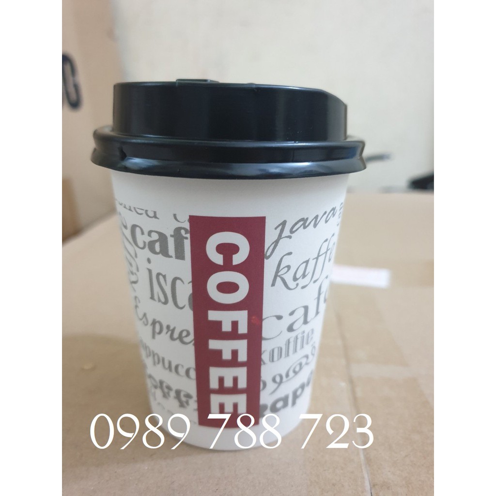 50 cốc giấy đựng cafe nóng 8oz (250ml) in sẵn logo dày đẹp nắp đen
