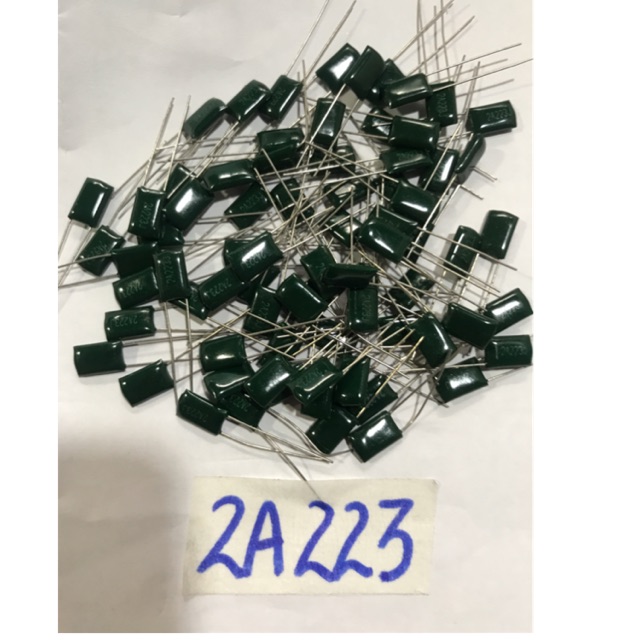 #Tumica2A223-Tụ mica 2A223 .Màu xanh lá .Hai đầu chân cắm .Điện áp 100V .Tụ 22nf .