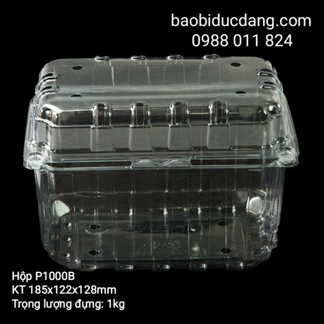 Hộp nhựa trong P1000B thường đóng gói trọng lượng tiêu chuẩn là 1kg các loại trái cây. Hộp nhựa trong đựng trái cây có ưu điểm hơn các loại hộp nhựa thường bởi có nhiều lỗ thoáng khí 2 bên cạnh hông và mặt trên của sản phẩm do đó sản phẩm không bị hấp hơi làm trái cây nhanh hỏng.