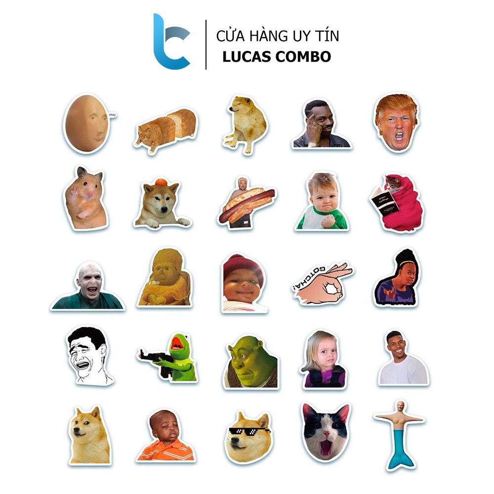 Bộ 50 Sticker chủ đề Meme, trào lưu Internet - Sticker còn gọi là decal, tem, hình dán dùng để trang trí lên tất cả bề mặt cứng: mũ bảo hiểm, laptop, xe máy, ô tô, vali, tường, cửa nhà, tủ quần áo...Một Set Sticker hình dán gồm 50 sticker được cắt rời 100%. Kích thước mỗi con sticker là ngẫu nhiên khoảng 6 x 6 cm trở xuống. Được phủ một lớp màn cao cấp giúp chống trầy Anti Scratch, chống thấm nước Waterproof 100%, không phai màu dưới ánh nắng Sun Protection.