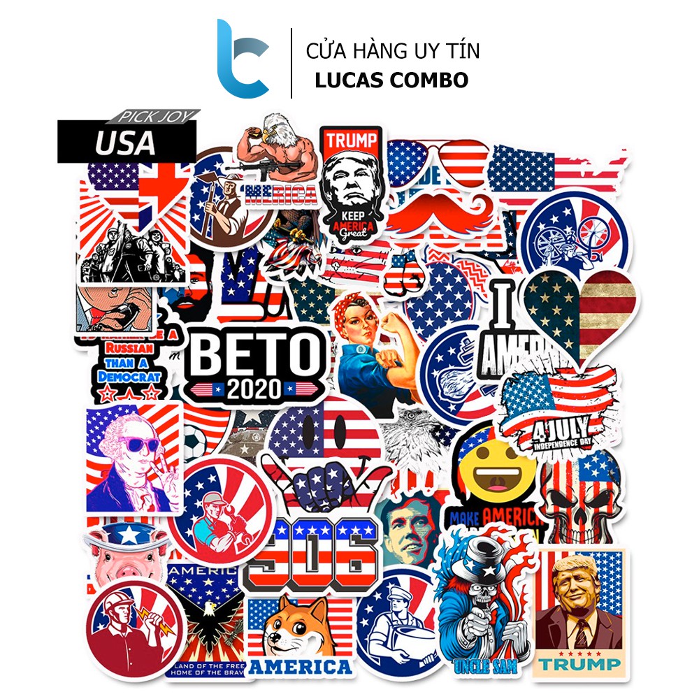 Bộ 50 Sticker chủ đề nước Mỹ - Sticker còn gọi là decal, tem, hình dán dùng để trang trí lên tất cả bề mặt cứng: mũ bảo hiểm, laptop, xe máy, ô tô, vali, tường, cửa nhà, tủ quần áo.- Một Set Sticker hình dán gồm 50 sticker được cắt rời 100%. Kích thước mỗi con sticker là ngẫu nhiên khoảng 6 x 6 cm trở xuống. Được phủ một lớp màn cao cấp giúp chống trầy Anti Scratch, chống thấm nước Waterproof 100%, không phai màu dưới ánh nắng Sun Protection.