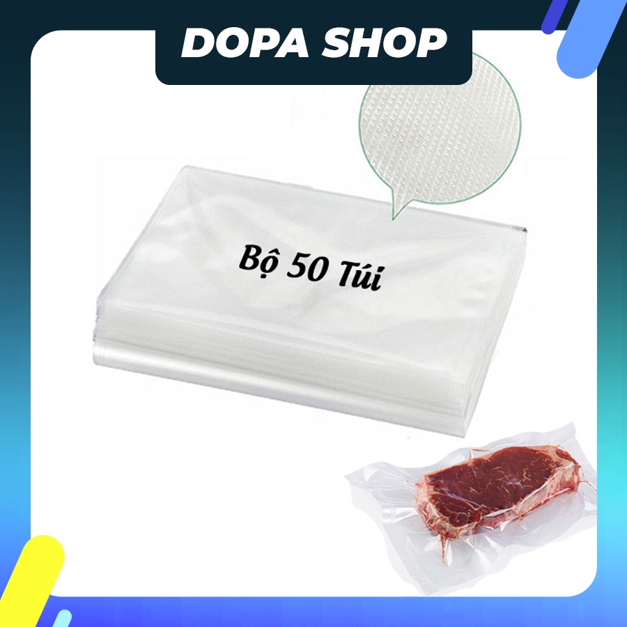 Giới thiệu Bộ 50 túi hút chân không một mặt nhám đựng thực phẩmTúi PA/PE hút chân không là các túi dùng để bảo quản thực phẩm bên trong và được xử lý theo công nghệ rút chân không bằng máy hút chân không chuyên dụng.Sau khi hút hết không khí,máy hút chân không có tác dụng hàn kín mép túi để không khí không bị tràn vào túi.Nhằm đảm bảo thời gian sử dụng của sản phẩm được lâu hơn, giữ được chất lượng nguyên thủy của sản phẩm bên trong, không bị không khí môi trường làm ảnh hưởng tới chất lượng sản phẩm, thực phẩm.