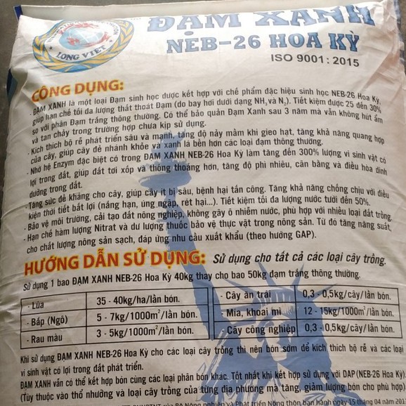 - Đạm Xanh ( ure+ neb 26 Hoa Kỳ), với chế phẩm sinh học NEB 26 là loại siêu phân bón được hãng AGMOR.INC Hoa Kỳ Nghiên cứu, được sản xuất theo công nghệ nano tiên tiến tại các Công ty phân bón hàng đầu của Mỹ. Chế phẩm sinh học siêu phân bón này chứa nhiều chất dinh dưỡng như: Các loại vi sinh vật hữu ích, chất hữu cơ, Lân, Kaly dễ tieu cùng một số nguyên tố trung và vi lượng thích hợp vớinhiều loại cây trồng nôngnghiệp.NEB-26 HOA KỲ cung cấp đầy đủ các chất dinh dưỡng trung vi lượng giúp cân bằng và điều hòa dinh dưỡng cho đất và cây trồng.
