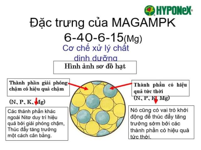 Đặc trưng của MAGAMPK 6-40-6-15(mg)Là phân bón giải phóng chậm mà thành phần đáp ứng với axit gốc, axit hữu cơ