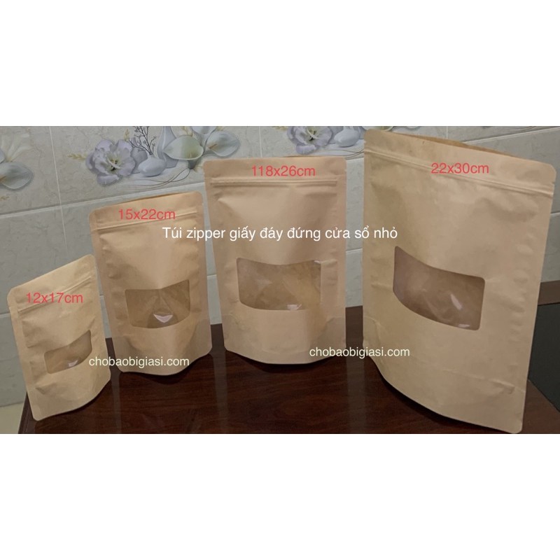 - Kích thước túi zipper giấy cửa sổ NHỎ: có 4 size lựa chọn (12x17cm, 15x22cm, 18x26cm, 22x30cm)