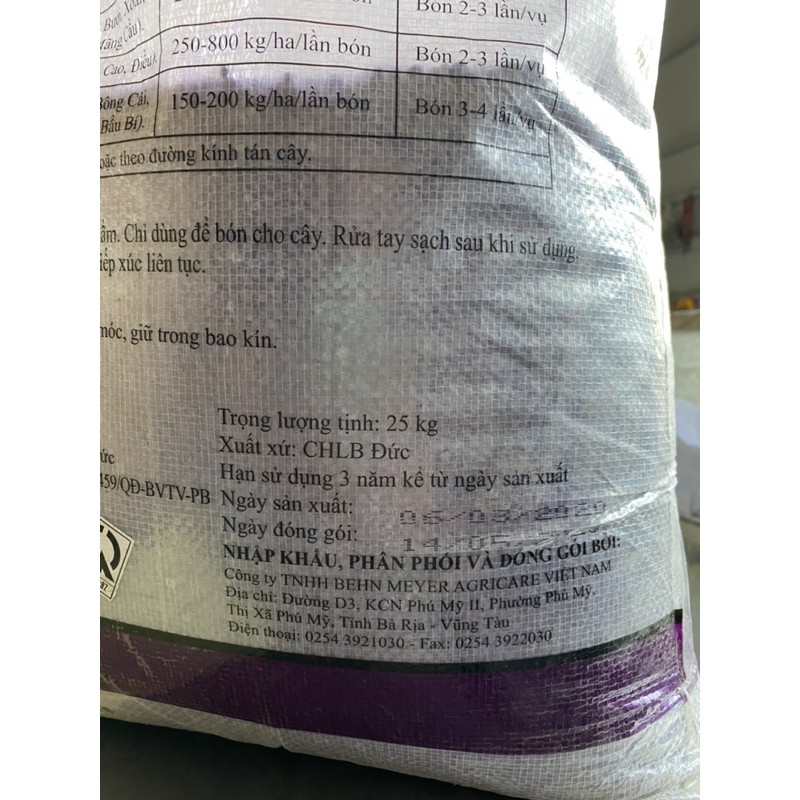 Sản phẩm nhập khẩu CHLB ĐứcThành phần ; Đạm 15% ; Lân 3% ; Kali 20% Lưu huỳnh 10% ; Magie 1,2% ; Bo 200ppm ; Kẽm 100ppm ; sắt 600ppm ; Độ ẩm 5%