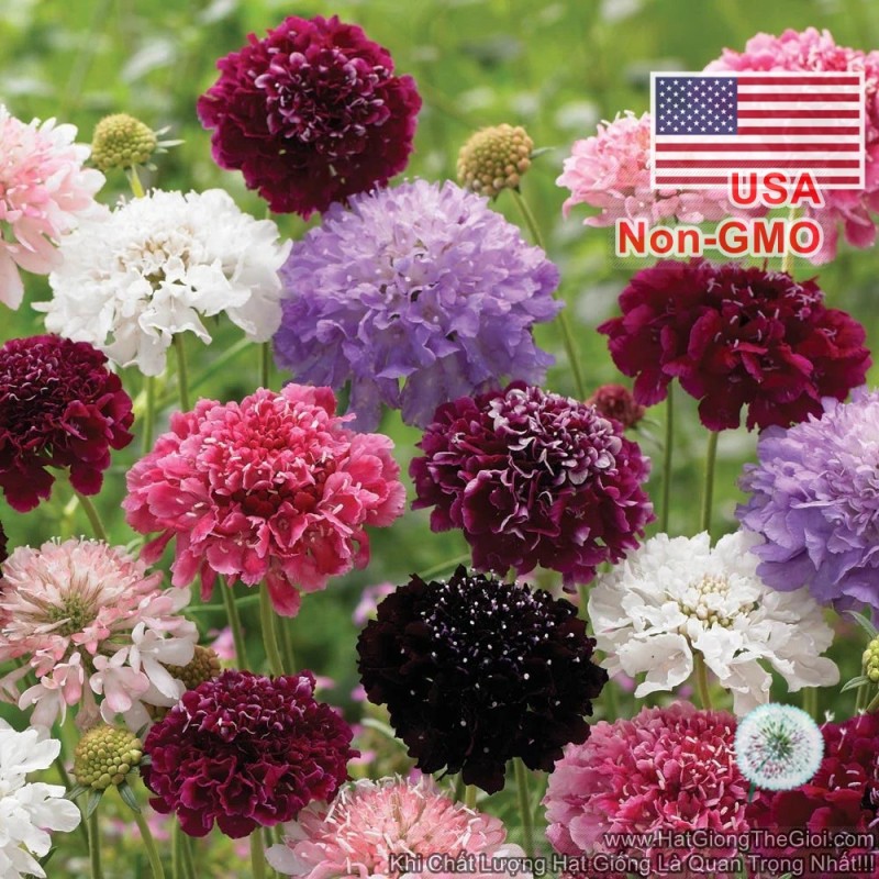 Gói 50 hatHoa Cúc Tai Thỏ Cầu Lửa Scabiosa Mix Màu (Scabiosa) dòng hoa kép trong dài màu hồng, đỏ, trắng, xanh blue nhạt, tím. Cành hoa cứng dài trên thân cây cao 1m. Cắt và hoa lại tiếp tục cho ra nữa. Hương hoa tựa mùi mật ong. Giống ha lâu năm xuất nguồn từ miền Nam Châu Âu.