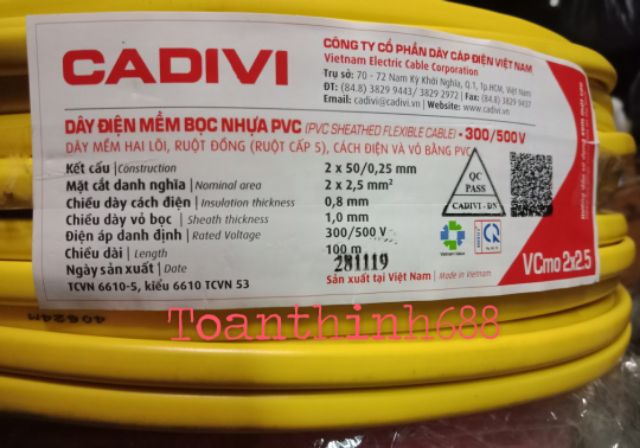 Đảm Bảo Hàng Chính Hãng Cadivi 100% dây đồng¤ Đủ tiết diện dây đồng 2x2.5mm²(2x50/0,25mm)