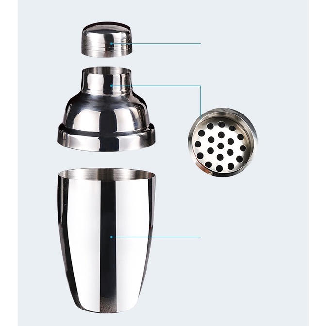 Bình lắc này bạn có thể sử dụng pha chế rượu, cafe, một cách chuyên nghiệp hay đơn giản sử dụng pha chế cho bạn bè, người thân mình những ly nước thơm ngon và nhanh chóng- Cấu tạo 3 phần: