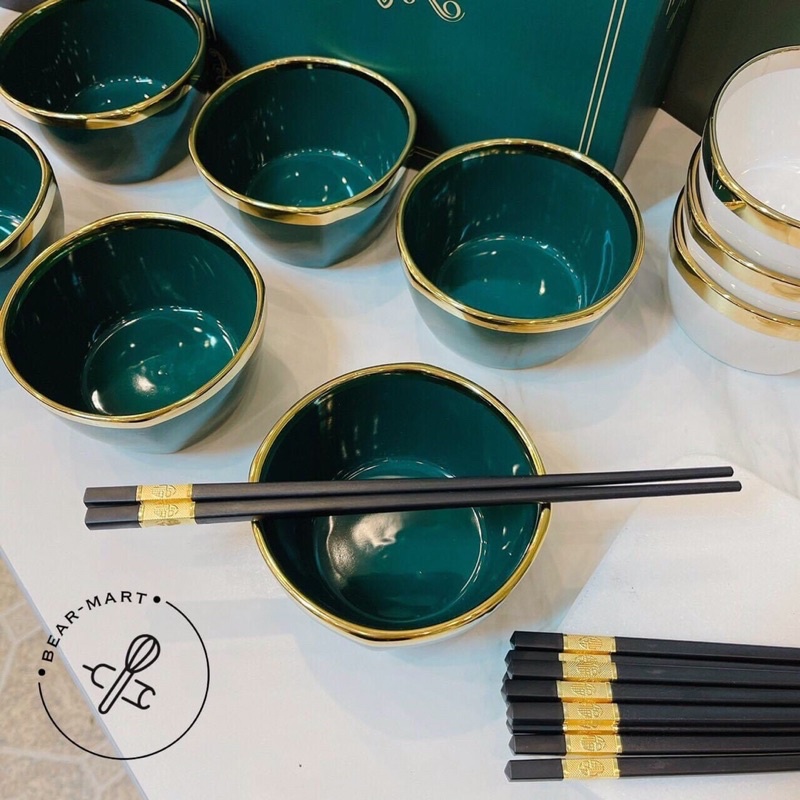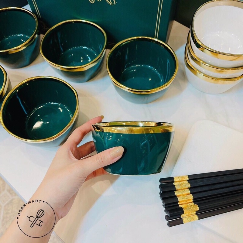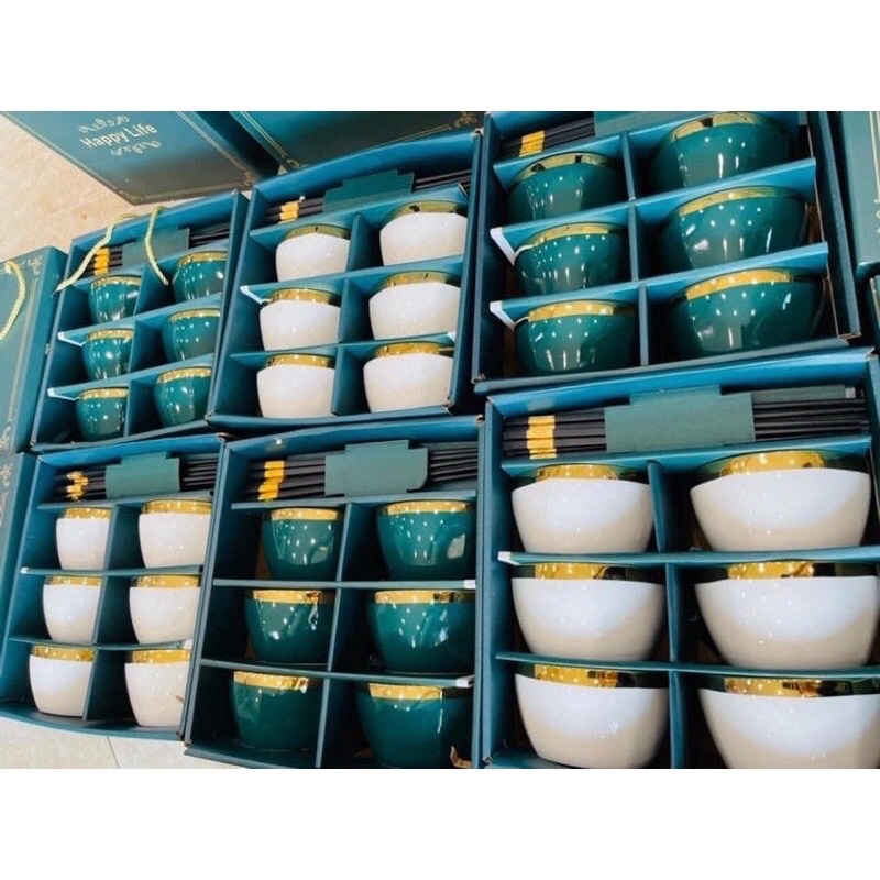 ❌ Bộ 6 Bát Sứ Viền Mạ Vàng Cao Cấp HAPPY LIFE Tặng Kèm Đũa