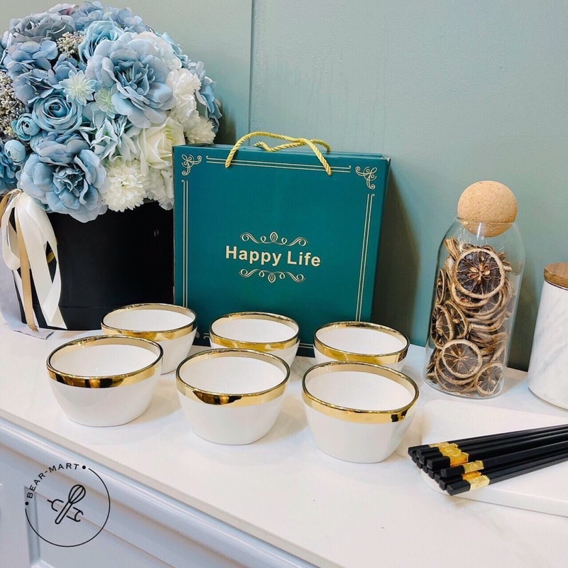 Bộ 6 Bát Sứ Viền Mạ Vàng Cao Cấp Happy Life Tặng Kèm Đũa
