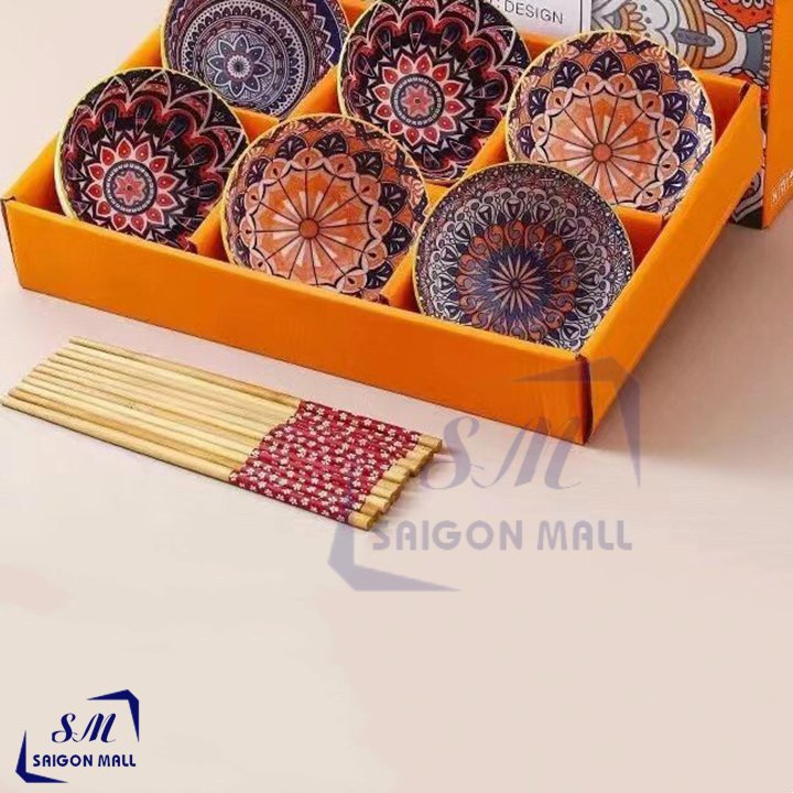 Bộ 6 chén 6 đũa hoạ tiết hoa văn cao cấp, hiện đại có hộp đẹp làm quà tặng