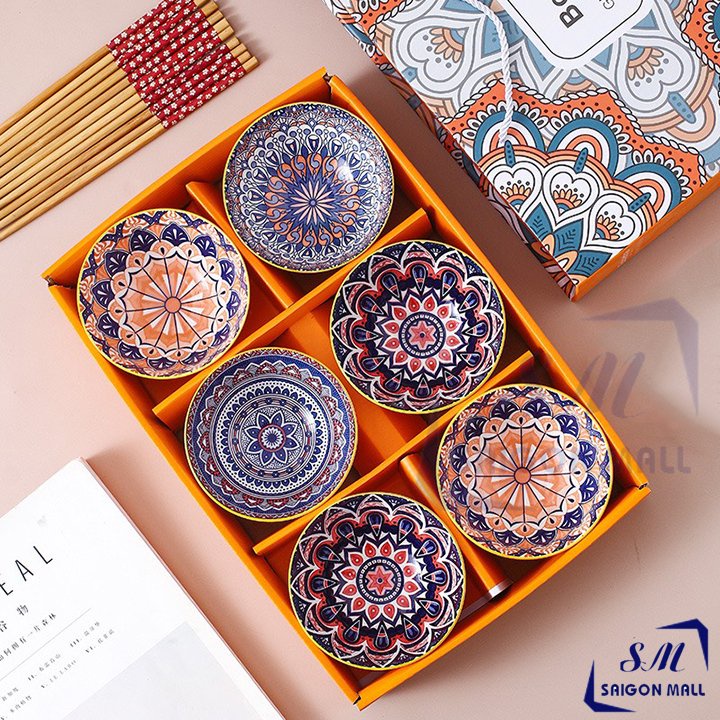 Bộ 6 chén kiểu hoa văn cao cấp và 6 đôi đũa kèm hộp làm quà tặng sang trọngBộ sản phẩm bao gồm: