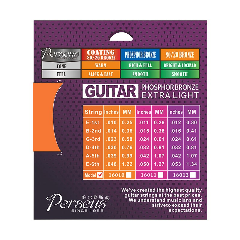 Perseus là thương hiệu phụ kiên âm nhạc nội địa Trung Quốc ra đời năm 1988, về dây guitar hãng tập chung chủ yếu phát triển dòng dây phosphor bronze, với giá thành thấp nhưng chất lượng cực kỳ tốt.Thông số dây