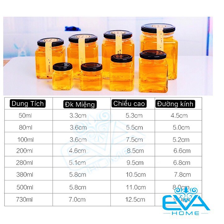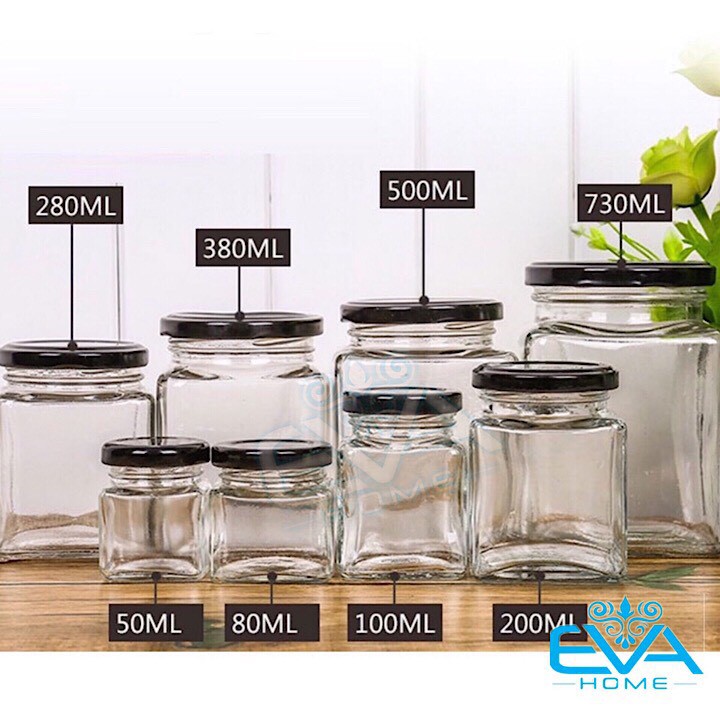 - *** Hũ thuỷ tinh kiểu dáng vuông gồm có các loại dung tích như sau cho bạn lựa chọn