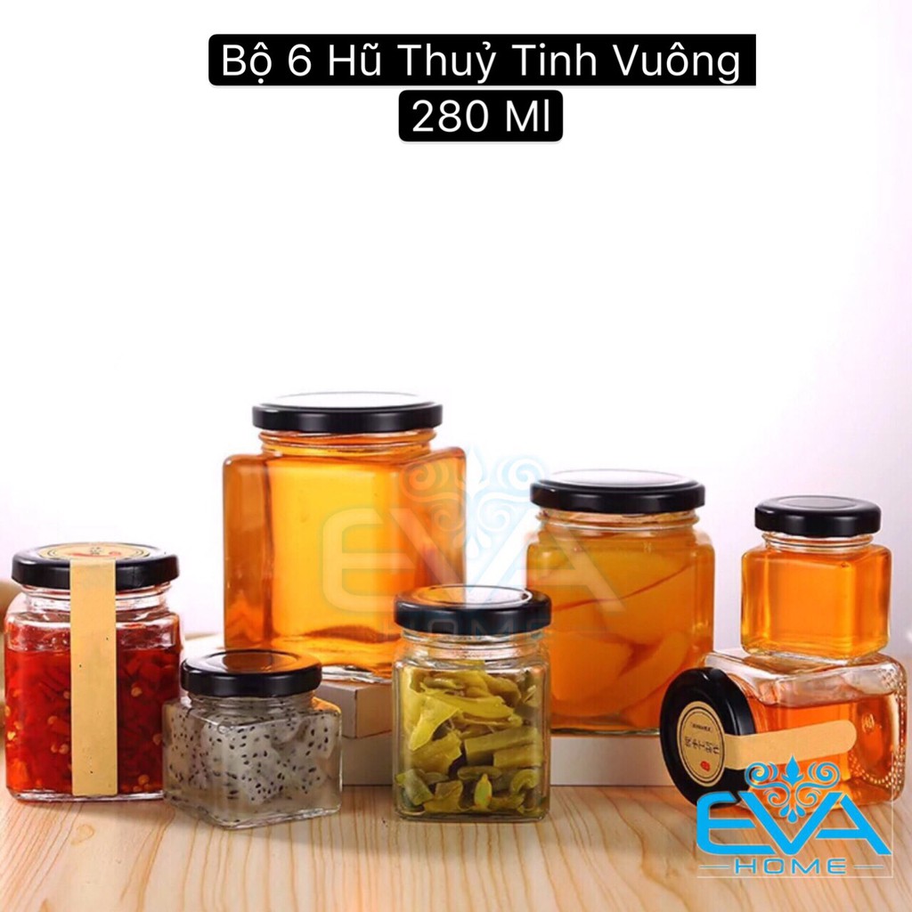 - Bộ sản phẩm gồm : 6 lọ vuông thuỷ tinh 280 ml