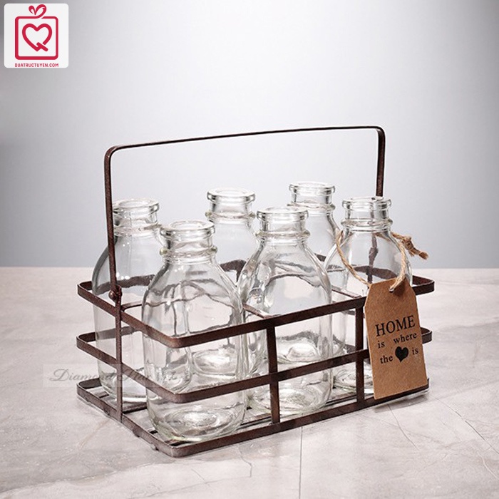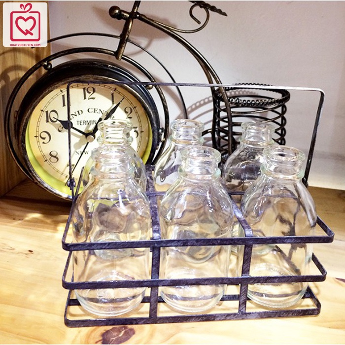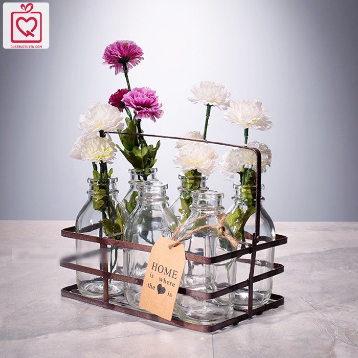 - Chất liệu: 6 Lọ hoa chất liệu thủy tinh + 1 giá đỡ bằng sắt không gỉ