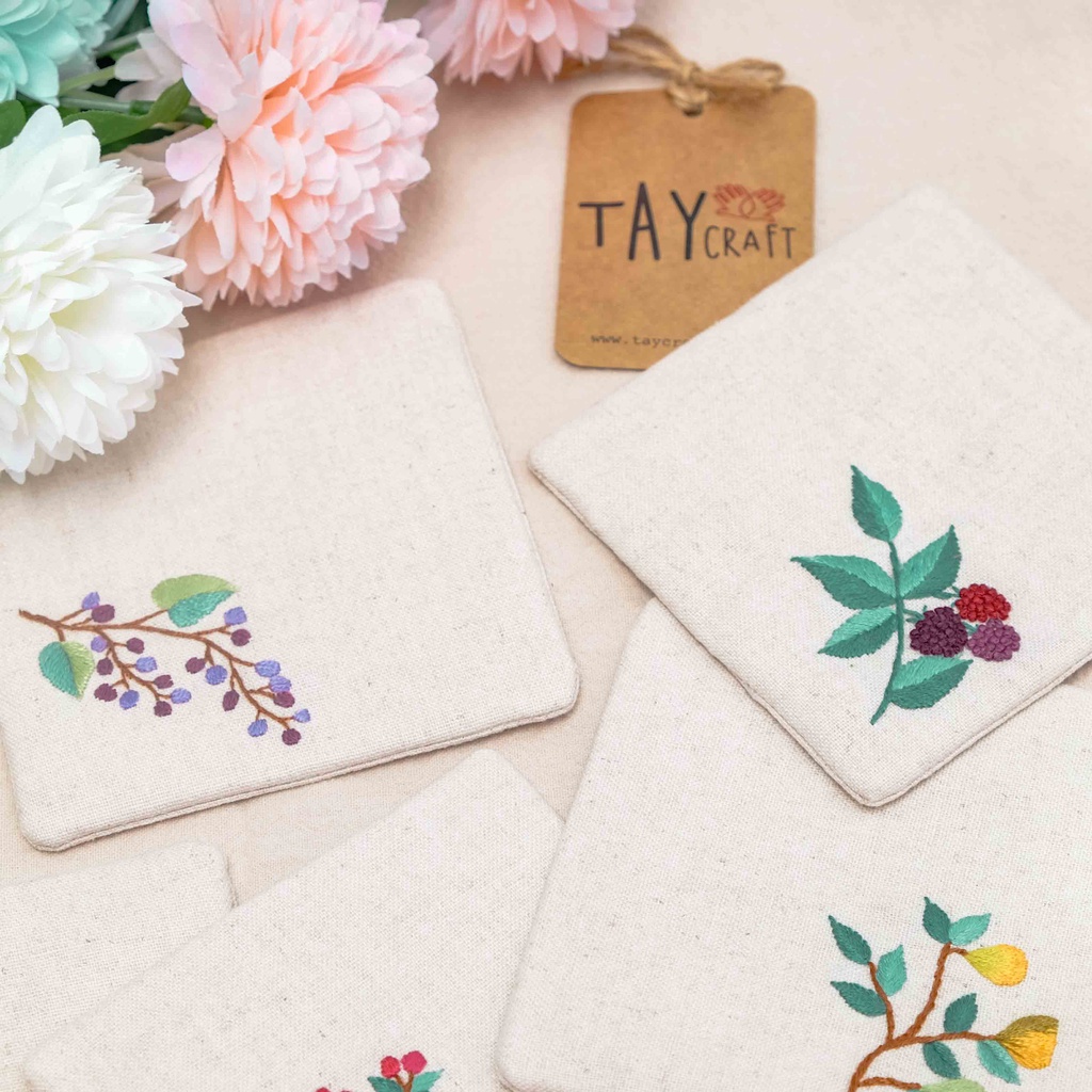 Giới thiệu Bộ 6 lót ly cốc thủ công thêu tay theo chủ đề cây cối hoa quả
