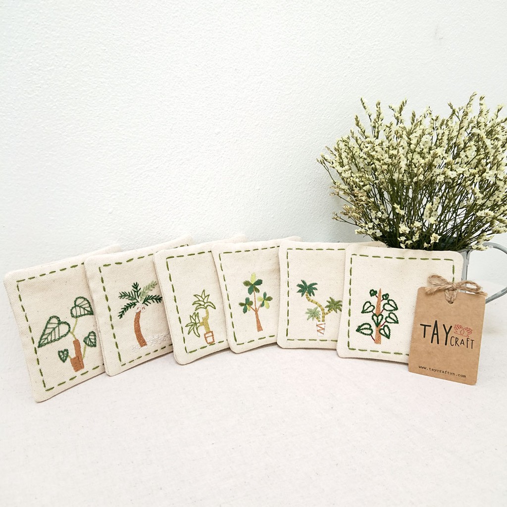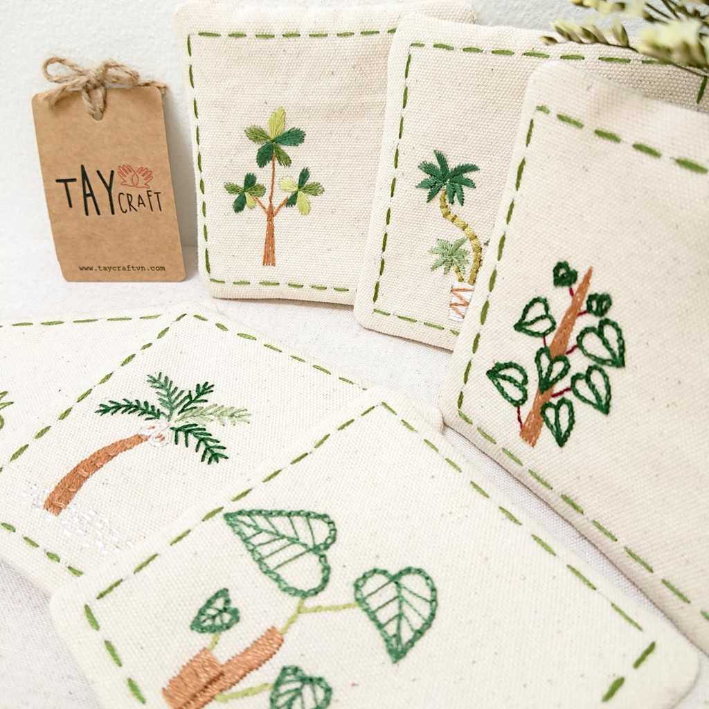 - Bộ sản phẩm bao gồm 06 lót ly thủ công với 06 hình thêu cây lá nhiệt đới