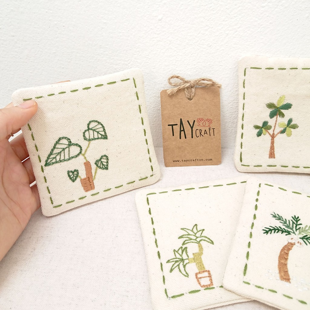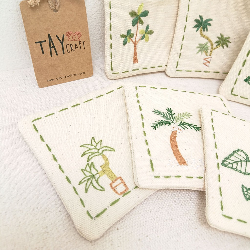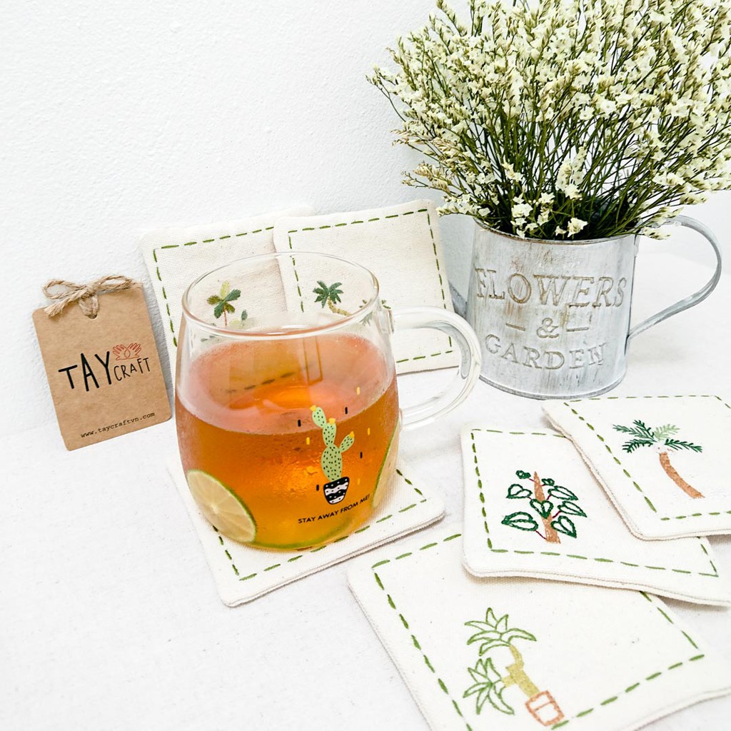 Bộ lót ly thủ công được TAY Craft thiết kế và hoàn thiện thủ công hoàn toàn bằng tay. Lót ly tại TAY Craft sử dụng chất liệu vải bố (canvas) dày dặn dệt 100% từ sợi cotton, có độ bền cao và lành tính, không chứa hóa chất độc hại. Bề mặt vải thô mộc và chắc, chống trơn trượt, bền bỉ và dễ vệ sinh, vì vậy rất phù hợp để làm đồ lót ly, lót cốc. Với họa tiết thêu hình cây lá nhiệt đới mát mắt, đơn giản và tinh tế, sản phẩm vừa giúp mặt bàn luôn sạch đẹp, vừa khiến cho bộ cốc chén của bạn thêm phần xinh xắn.- Chất liệu: Lớp ngoài sử dụng vải bố (canvas) dày dặn, chỉ thêu eco-cotton, bên trong là một lớp bông lót tạo form và giúp thấm hút tốt