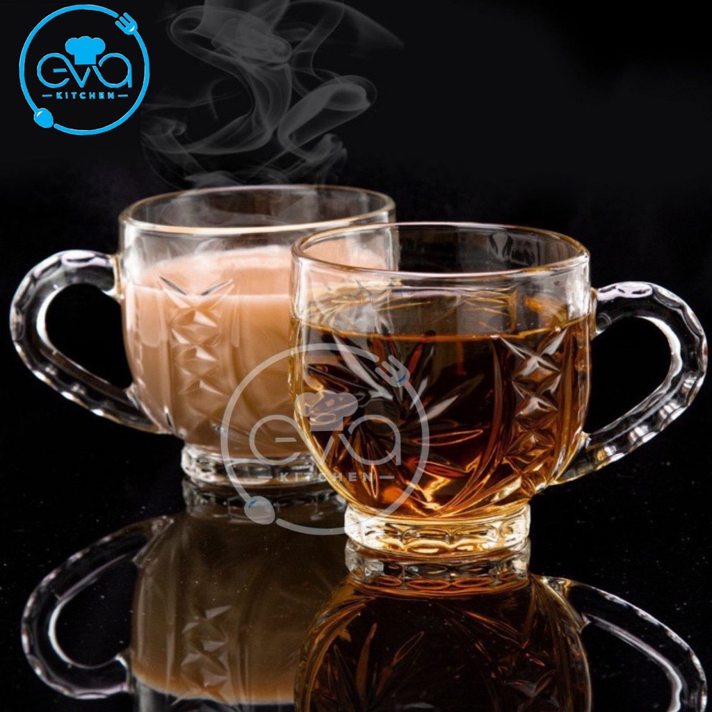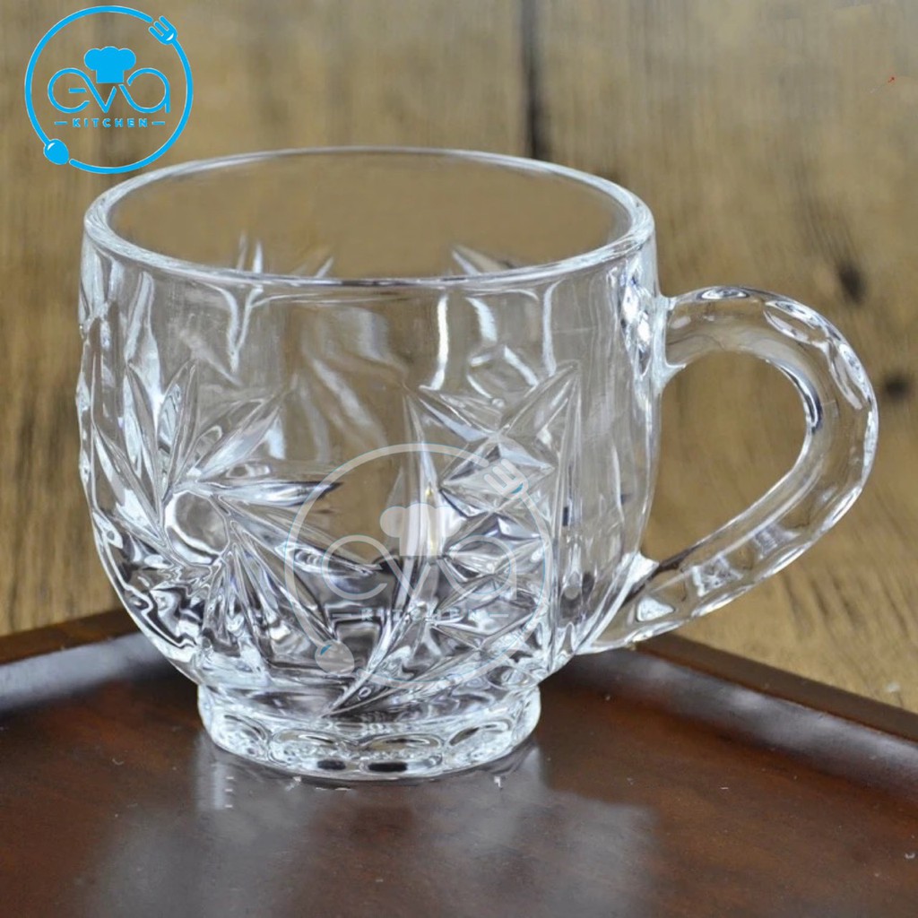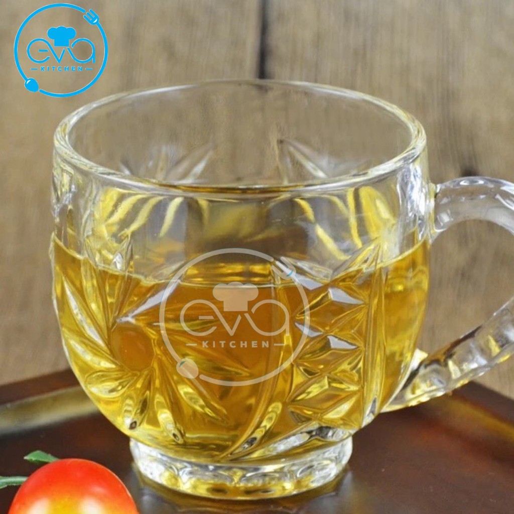 - Sản phẩm gồm : 6 ly thuỷ tinh / 6 cốc thuỷ tinh có quai cầm xoáy trắng