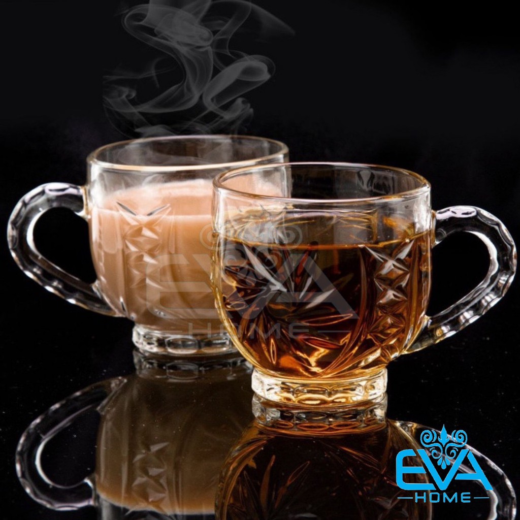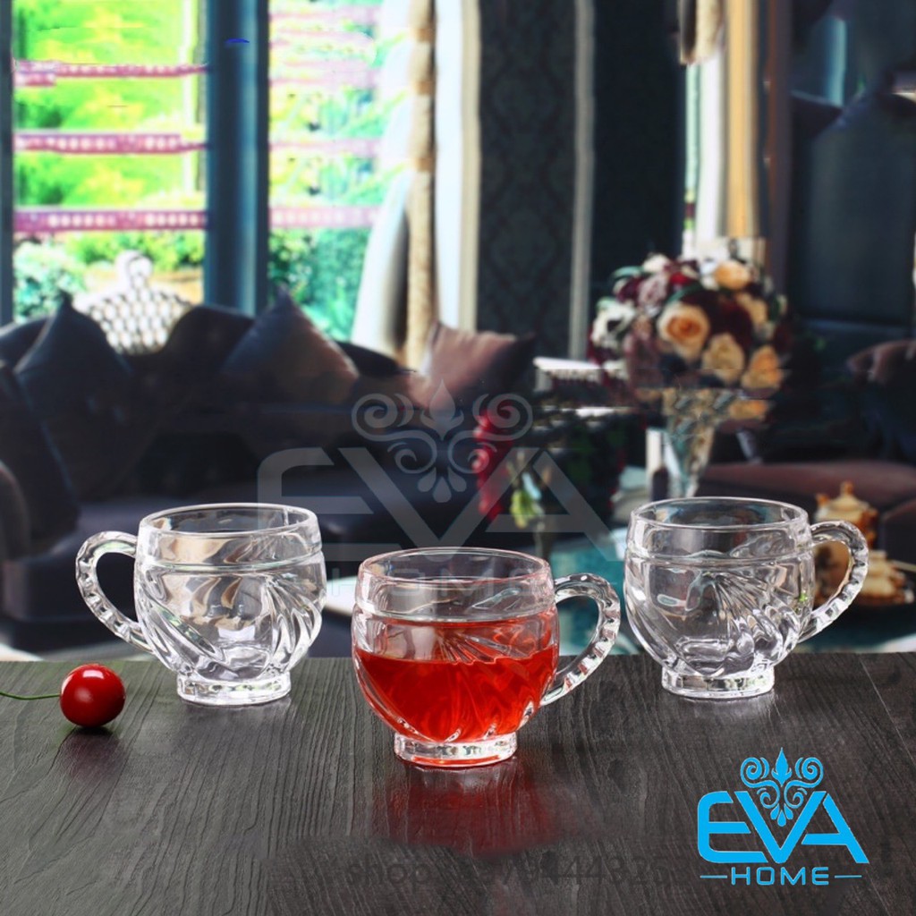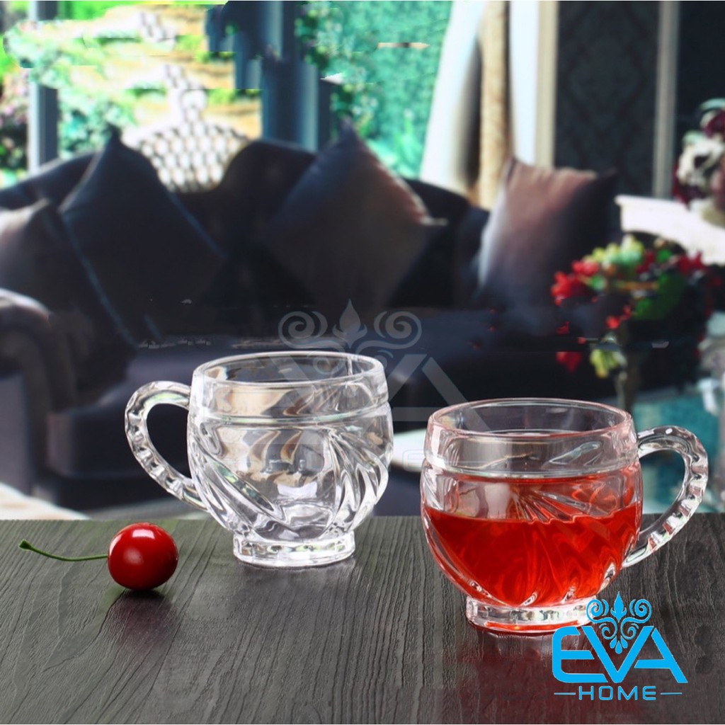- Sản phẩm gồm : 6 ly thuỷ tinh / 6 cốc thuỷ tinh có quai cầm xoáy trắng