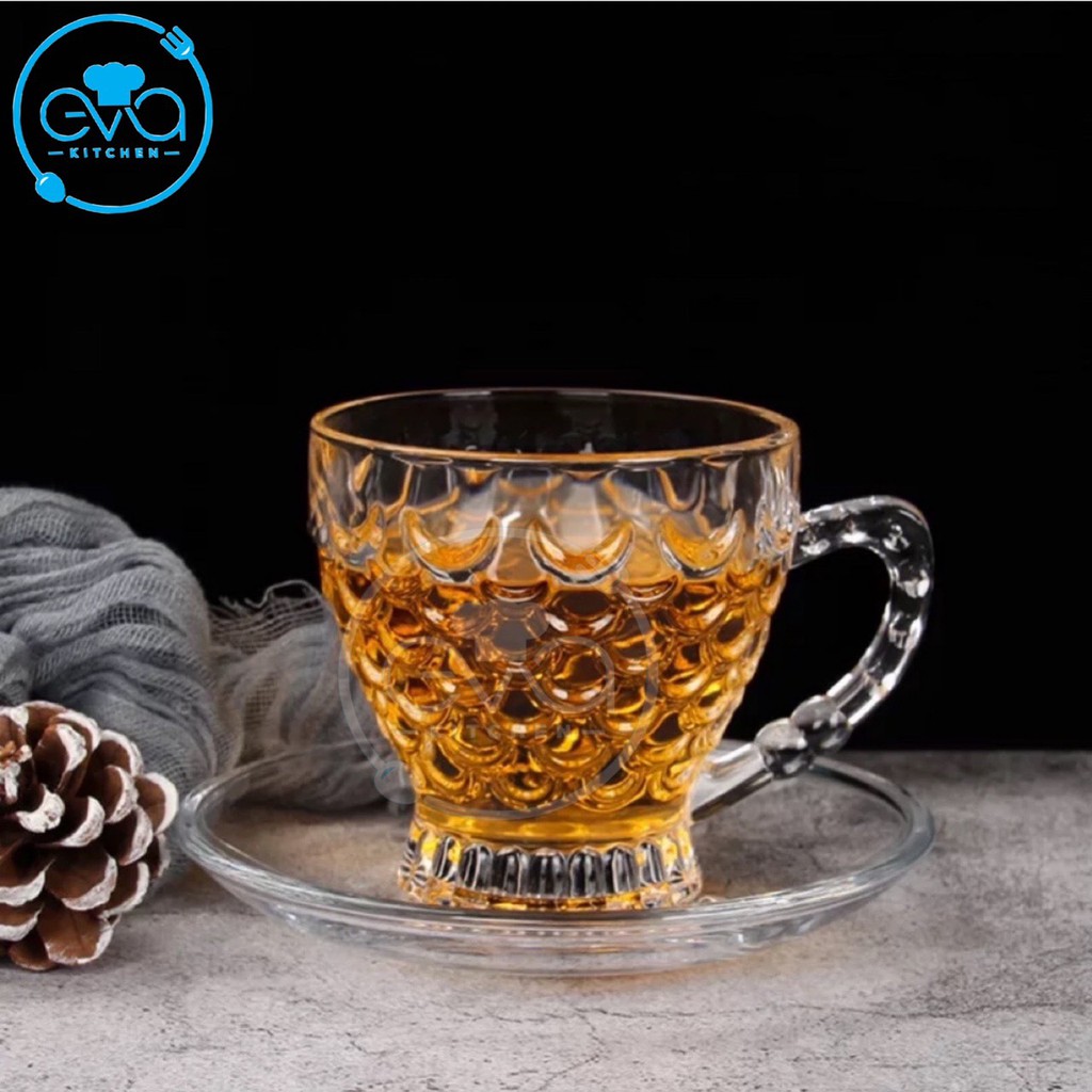 - Công Dụng : tách trà thuỷ tinh Trong suốt sáng trọng nên Màu sắc của nước trà, cánh trà, hoa trà hay lớp sương khói mờ ảo cũng được thể hiện toàn bộ bên trong lớp thủy tinh trong suốt, mang lại một cảm quan duy mĩ, cảm giác thư thái cho việc thưởng trà. hoạ tiết vẩy cá và quai cầm trạm khắc chống trượt và làm cho tách trà thêm sang trọng và bắt mắt