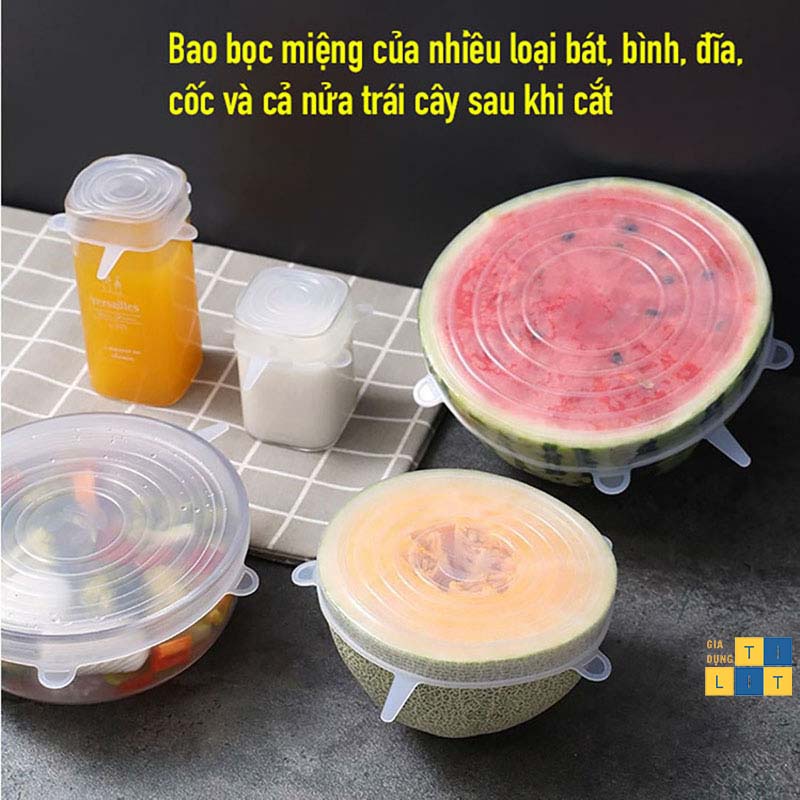 ✔️ Công dụng của những chiếc nắp đậy này tương tự như màng bọc thực phẩm nilong quen thuộc, bao bọc miệng của nhiều loại bát, bình, đĩa, cốc và cả nửa trái cây sau khi cắt.
