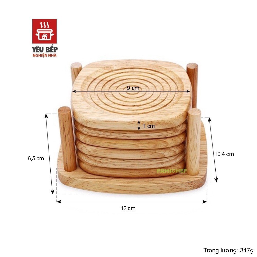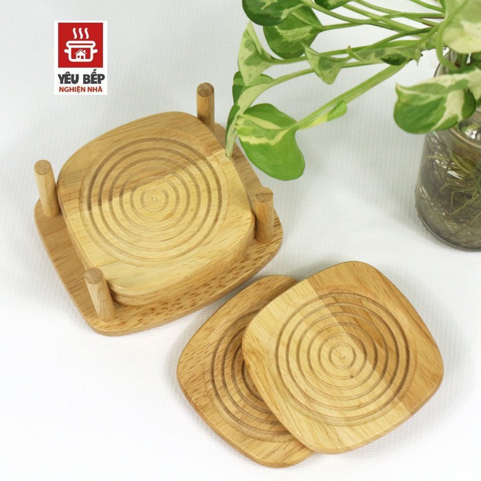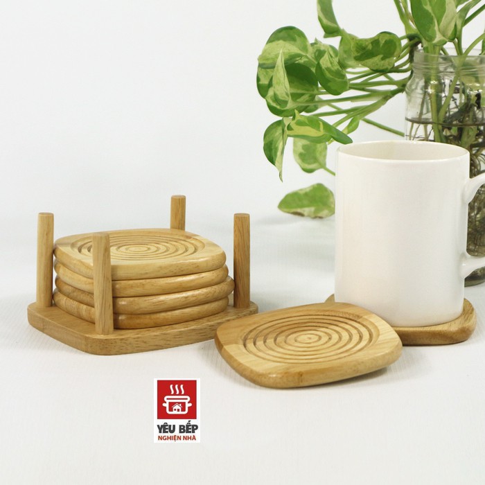 - Được làm từ gỗ cao su, bề mặt miếng lót được thiết kế các đường vân nổi để tạo ma sát với đế ly.