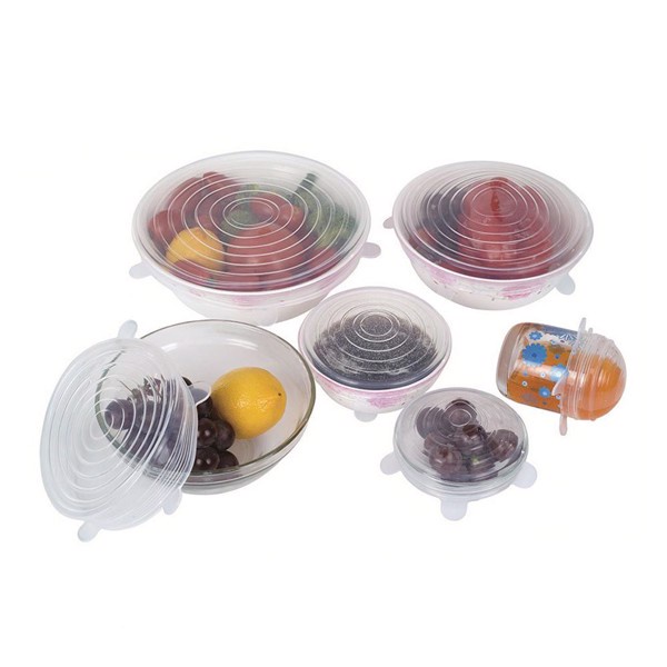Bộ 6 Miếng Silicone Bọc Thực Phẩm Cao Cấp - Nắp Đậy Màng Silicon Bảo Quản Thức Ăn Dày Dặn Độ Co Giãn TốtCăn bếp của các gia đình luôn có cả lố hộp nhựa rồi thuỷ tinh để đựng bảo quản thức ăn. Nhưng đôi lúc các bà nội trợ vẫn phải sử dụng màng bọc thực phẩm để bảo quản một số loại hoa quả, bát canh thừa hay khi hộp đựng bị mất nắp. Nếu cảm thấy ngán ngẩm với cả đống hộp đựng lộn xộn mất nắp và muốn hạn chế dùng bọc nilong độc hại thì Bộ 6 nắp đậy silicon co giãn chính là giải pháp mà bạn đang tìm kiếm.