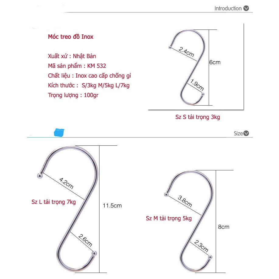 Bộ 6 móc Inox treo chữ S KM 532 hàng NhậtBộ gồm : 2 móc nhỏ, 2 móc vừa và 2 móc lớn