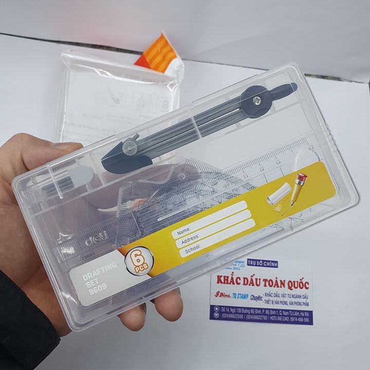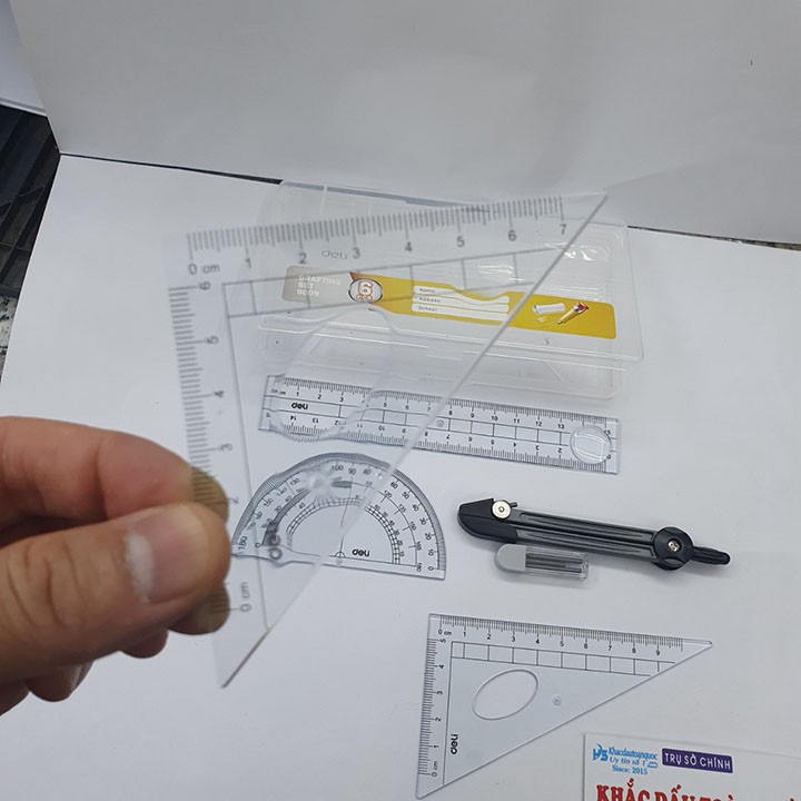 (1).THÔNG TIN SẢN PHẨM– Tên sản phẩm: Bộ 6 món dụng cụ đo gồm 2 Cái Eke, 1 Cái Compa, 1 Cái đo độ, 1 Vỉ ruột bút chì, 1 Thước kẻ ( Deli E9609)
