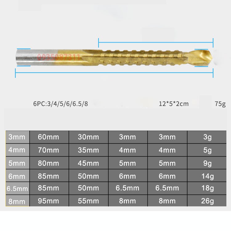 Giới thiệu sản phẩm Bộ 6 mũi khoan cưa gỗ,nhựa, mica, nhôm, đồng, sắt mỏng 3-8mm phủ titanChất liệu: thép gió HSS 4241