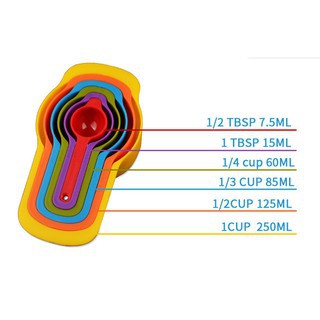Thông tin sản phẩm:Số lượng: 6 chiếc/bộ, gồm các kích cỡ: 1/2 tbsb + 1 tbsp + 1/4 cup + 1/3 cup + 1/2 cup + 1 cup (tương ứng 7.5ml + 15ml + 60ml + 85ml + 125ml + 250ml )