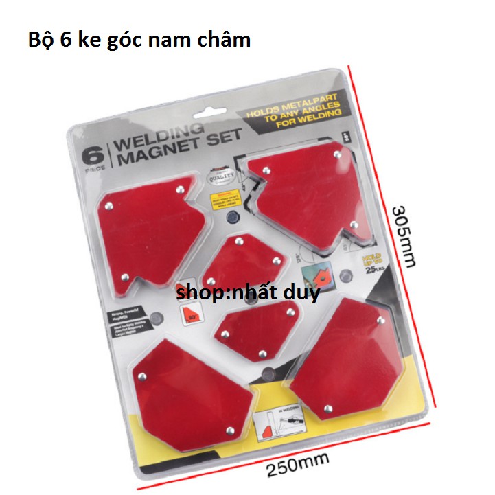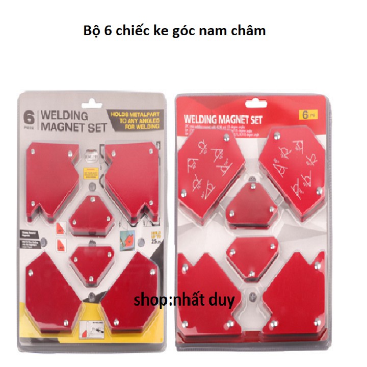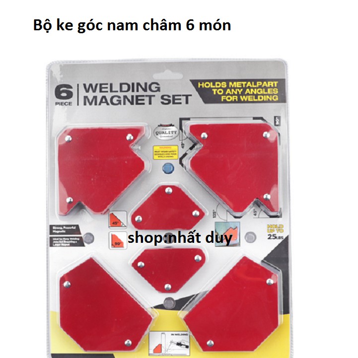 Bộ 6 ke góc nam châmBộ 6 nam châm ke góc vuông là sản phẩm vô cùng hữu ích trong công việc gia công các sản phẩm về sắt, là trợ thủ đắc lực cho thợ hàn, thợ cơ khí. Cơ chế hoạt động đơn giản nhờ lực hút nam châm mà người thợ có thể cố định thanh sắt theo theo các góc từ 30, 45, 60, 75, 90, 135 độ tăng năng suất lao động, tăng độ chính xác và tính thẩm mỹ cho sản phẩm.