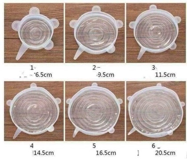 Bộ 6 nắp silicon gồm 6 kich cỡ khác nhau đáp ứng nhu cầu bảo quản thực phẩm của gia đình bạn. Nắp silicon có độ co giãn cao, vừa khít trên tô , chén, dĩa của gia đình nhà bạn