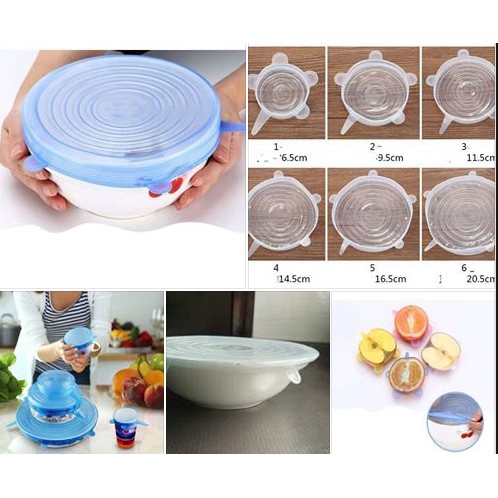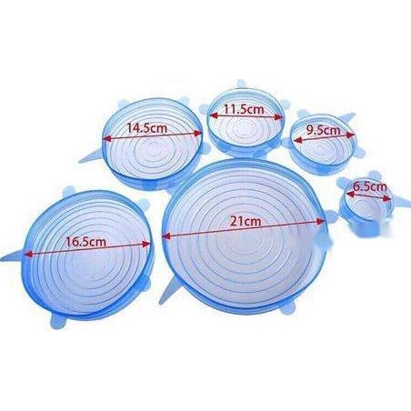 Bộ 6 nắp silicon gồm 6 kich cỡ khác nhau đáp ứng nhu cầu bảo quản thực phẩm của gia đình bạn. Nắp silicon có độ co giãn cao, vừa khít trên tô , chén, dĩa của gia đình nhà bạnBộ 6 nắp siicon có thể dùng trong tủ lạnh, vò vi sóng.