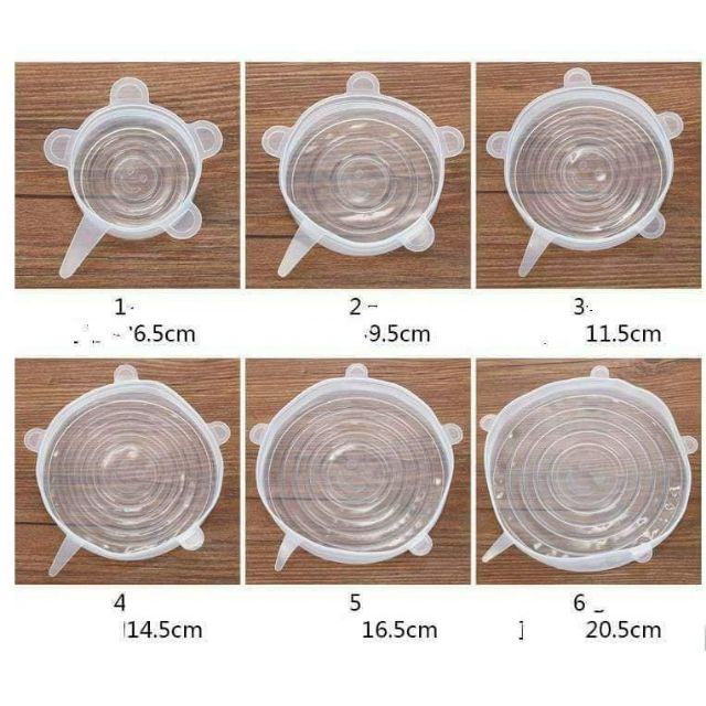 Set 6 nắp với 6 kích thước từ nhỏ đến lớn cùng khả năng co giãn hoàn hảo lên đến 3 lần kích thước thông thường giúp bọc kín rất nhiều các loại hình dạng và kích thước hộp, bát.