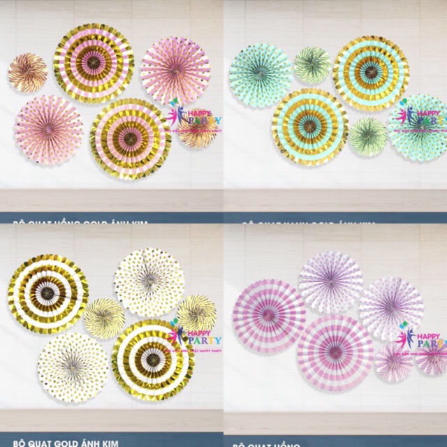 Set gồm 6 quạt lớn nhỏ như hình, quạt giấy trang trí làm backdrop đơn giản mà lên hình rất đẹp, phong cách hiện đại!kết hợp với dây chữ happy birthday ép kim cùng tông màu thì xinh lung linh, thời gian chuẩn bị cực nhanh, đơn giản .Có 3 màu xanh hồng vàngGiá NAWS