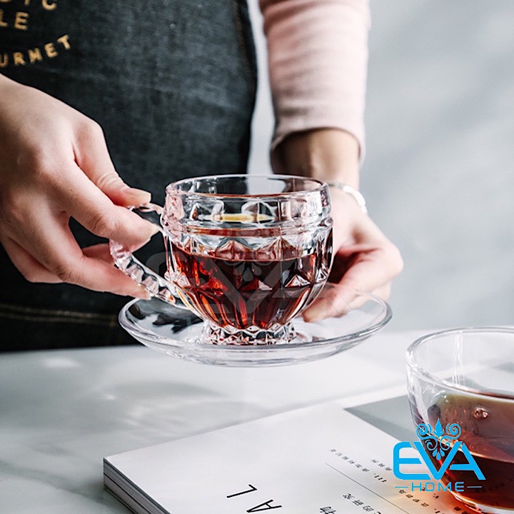 Bộ 6 Tách Thuỷ Tinh Hoạ Tiết Kim Cương Phong Cách Châu Âu Kèm 6 Dĩa Thuỷ Tinh Sang Trọng ZB231 M3440