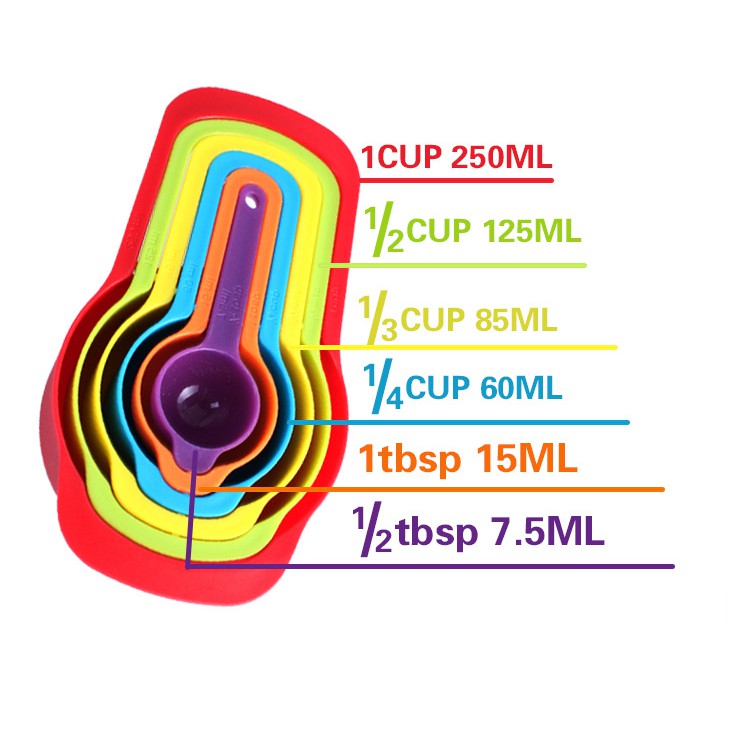 Bộ 6 thìa đong nhiều màu ((CUP,TSP,ML) là một trong những dụng cụ không thể thiếu trong gian bếp của mỗi người thợ làm bánh. Thế nhưng, có những lúc bạn cảm thấy “bối rối” vì bộ dụng cụ đo của mình lại không đong được đơn vị giống như trog công thức.Bộ 6 thìa đong: