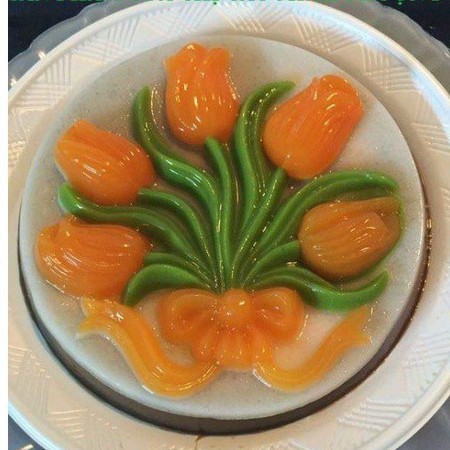 - Lấy thạch ra bằng cách up đĩa vào khuôn, lật ngược xuống, nhấc khuôn ra, bạn sẽ có được chiếc bánh gato rau câu 3D tuyệt đẹp ưng ý.
