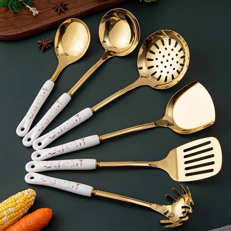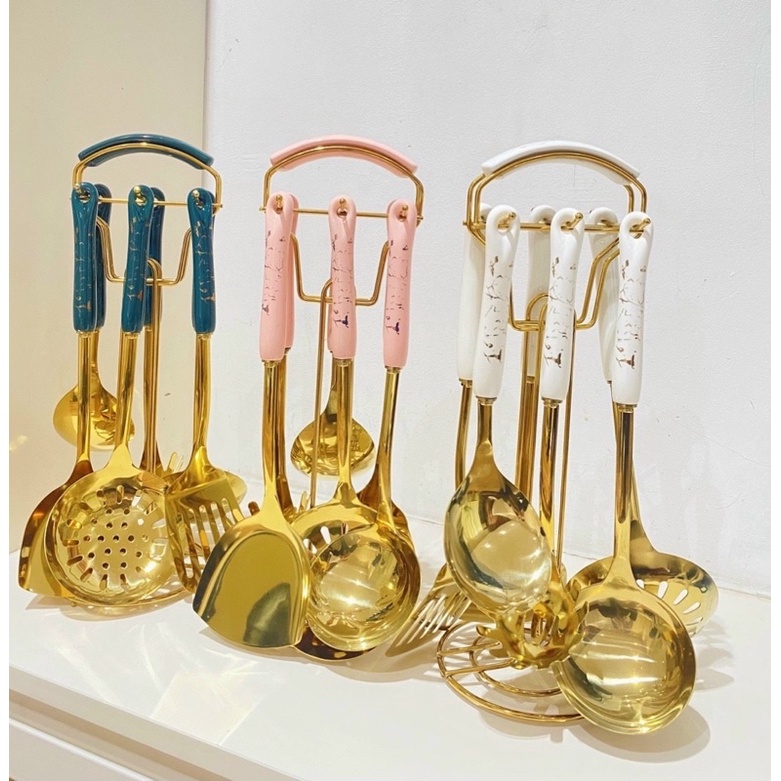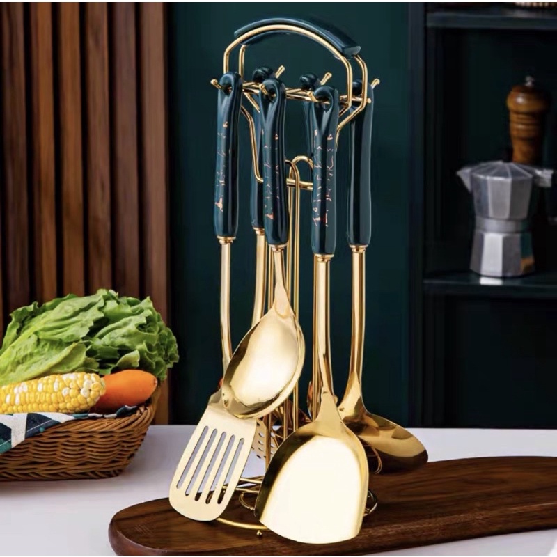 Bộ 7 Món Dụng Cụ Nấu Ăn Inox Mạ Vàng Cao Cấp Cán Sứ Cam Homeware