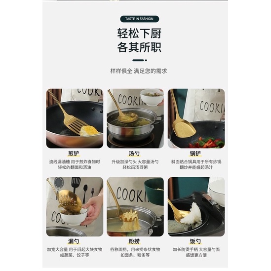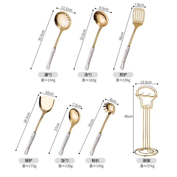 Nhà cửa & Đời sống > Dụng cụ nhà bếp > Cây vét bột & đồ gắp thức ăn || Bộ 7 Món Dụng Cụ Nấu Ăn Inox Mạ Vàng Cao Cấp Cán Sứ Cam HomewareCòn hàng